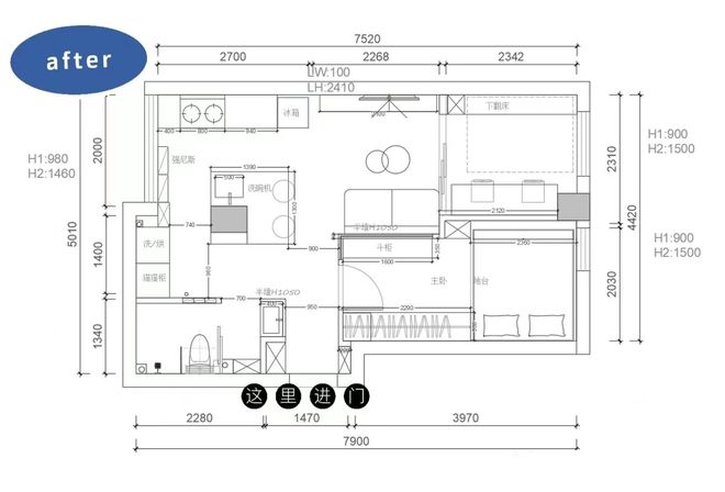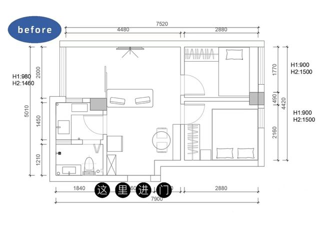 广州老房子给人最可怕感受,就是走进厨房和卫生间的一瞬间。原始卫生间的门开在狭小的厨房里面,暗卫洗漱蹲便和淋浴胡乱挤在一起,敞开对着做饭的位置。原始布局平面处处写满了人生的不如意。